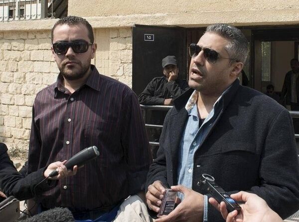 Al Jazeera English journalists Mohamed Fahmy, right, and Baher Mohamed speak to the media outside of a court in Cairo on March 19, 2015.SHADI BUSHRA/Reuters