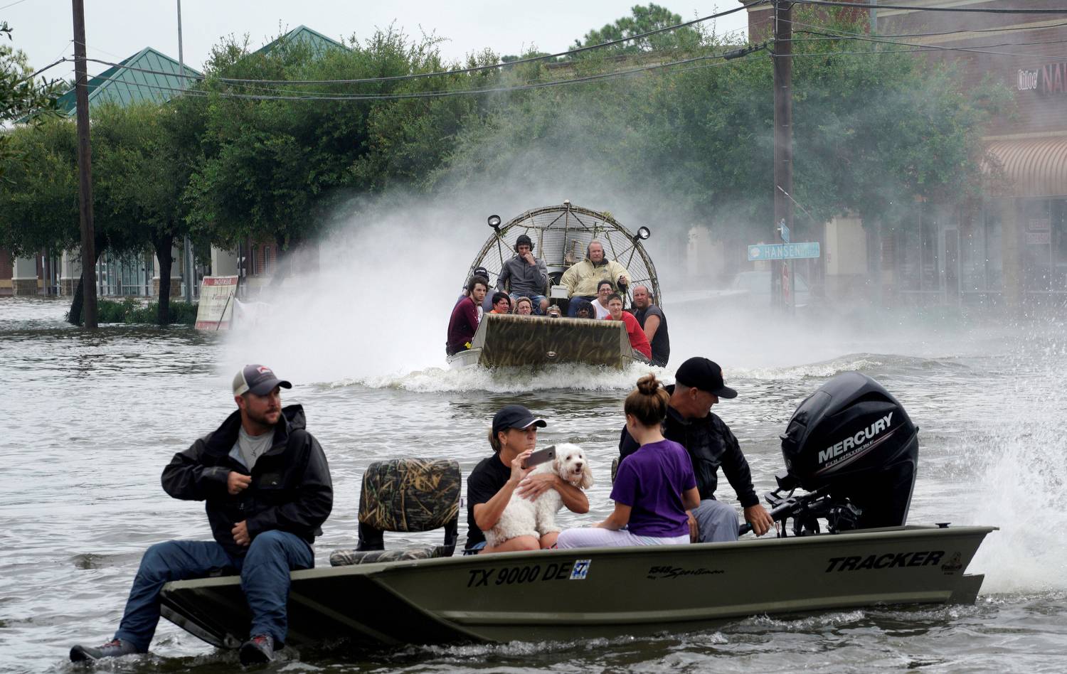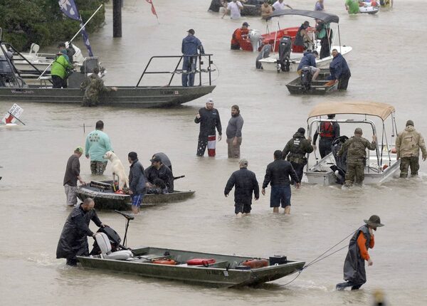 People and rescue boats line a street in Houston.Melissa Phillip/The Associated Press