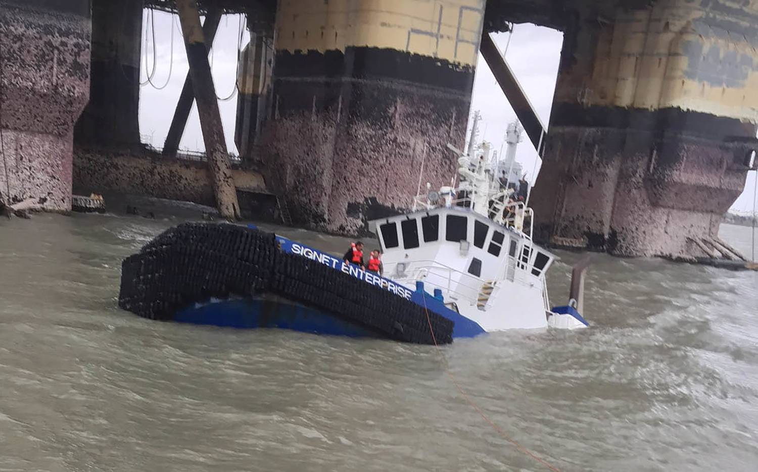 People stand on a sinking boat awaiting rescue from a U.S. Coast Guard helicopter near Port Aransas, Texas August 26.Supplied/Reuters