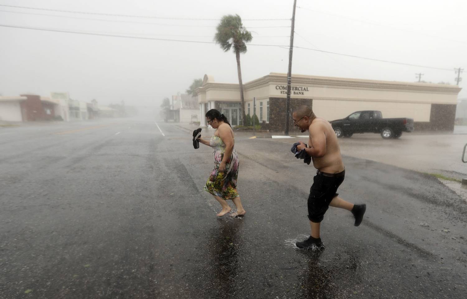 Antonio Barron, left, and his girlfriend, Melissa Rocha, run in a street during heavy rain in Palacios, Texas.David J. Phillip/The Associated Press