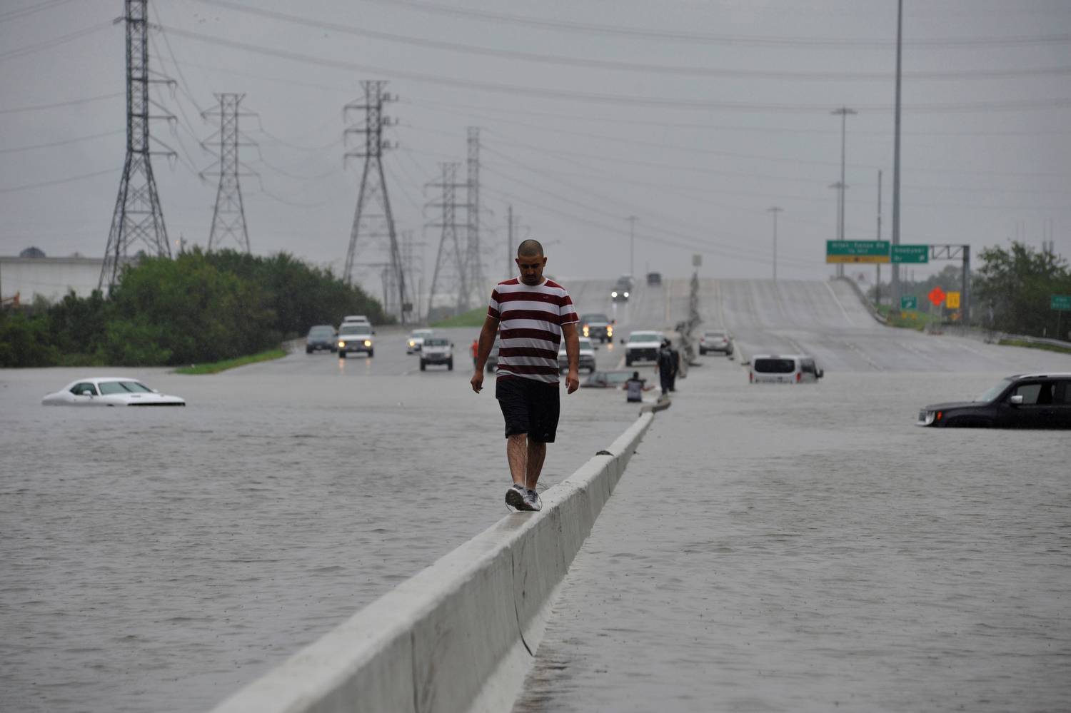 A car is submerged on a freeway near downtown Houston.Charlie Riedel/The Associated Press