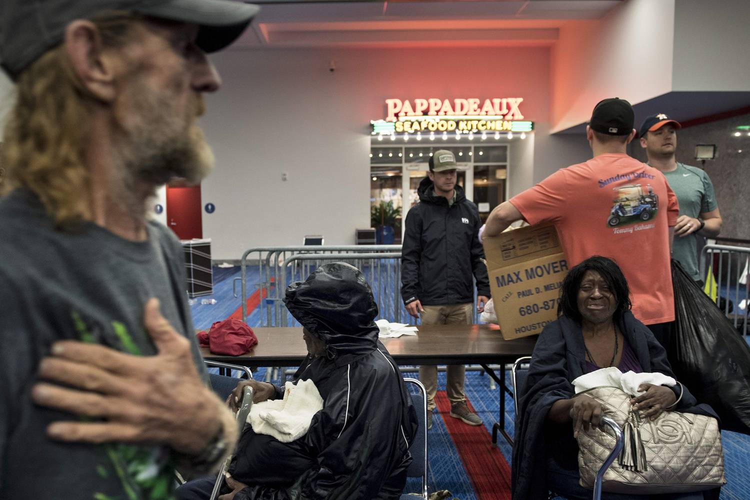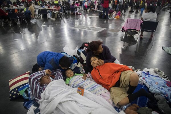 Galindo family members relax at the George R Brown Convention Center in Houston after living inside a car since Saturday.Marie D. De Jesus/The Associated Press