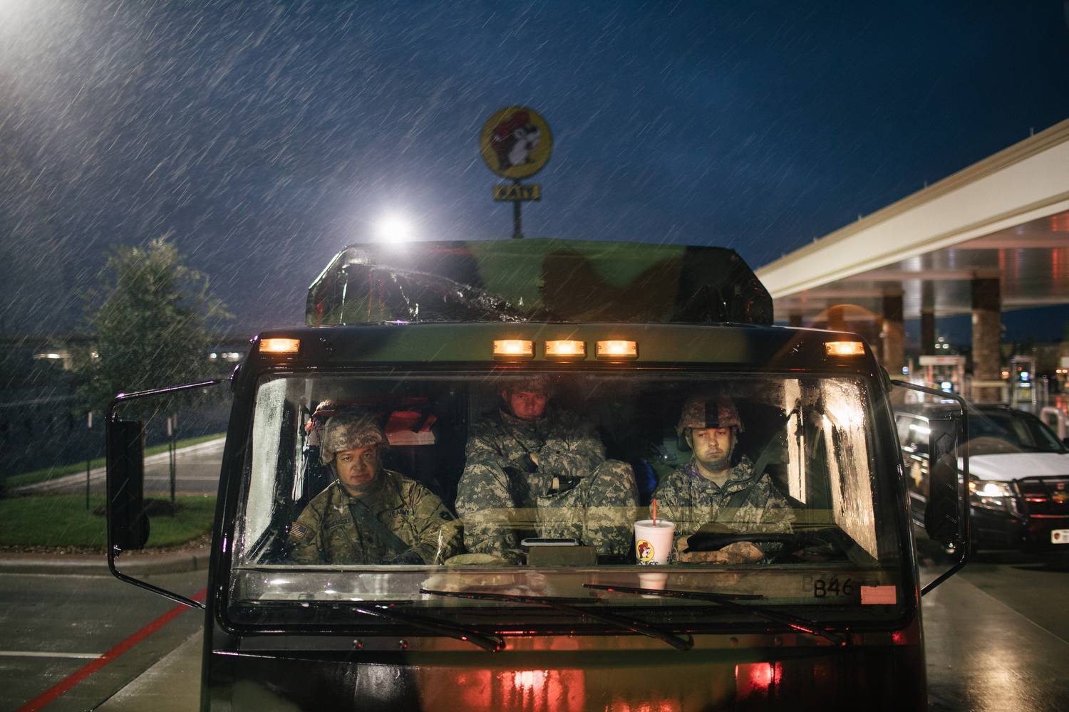 National Guard personnel head out for an evacuation mission from their staging area, a Buc-ee's convenience store in Katy, Texas.Alyssa Schukar/The New York Times
