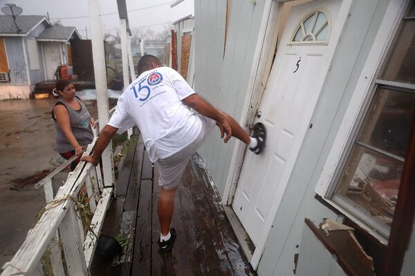 Lee Guerrero tries to kick open a door of an apartment after hearing his friends say they were hiding in the shower stall in Rockport.Joe Raedle/Getty Images