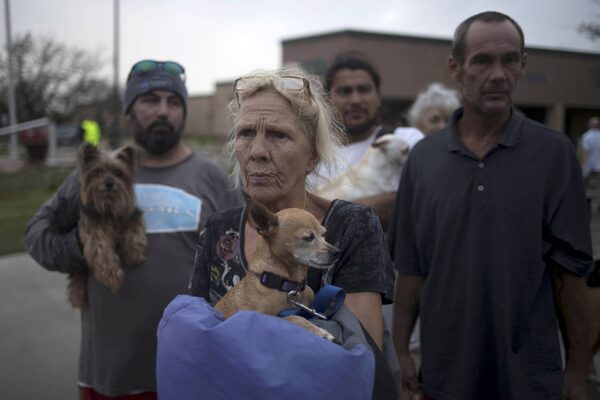 Julie holds her dog Pee-wee as they wait to be evacuated to Austin from Rockport, Texas.Adrees Latif/Reuters
