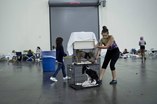 Flood victims move pets at a shelter in the George R. Brown Convention Center in Houston.BRENDAN SMIALOWSKI/AFP / Getty Images