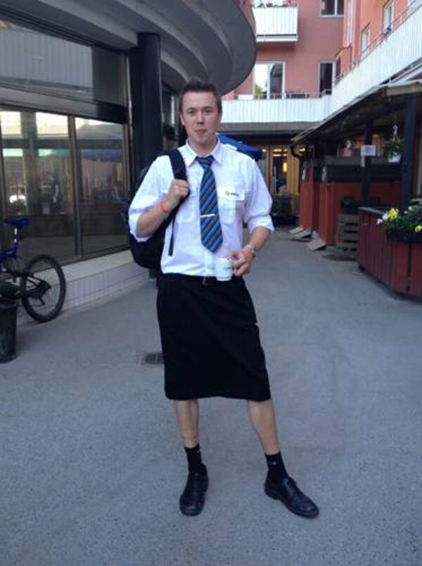 Swedish train driver Martin Akersten poses wearing a skirt in Stockholm on May 31, 2013. He says more than a dozen others at the Roslagsbanan line have started wearing skirts in the summer as a protest against the train company’s uniform policy, which doesn’t allow shorts. The 30-year-old Akersten said Sunday the response from customers has been only positive.Kim Jensen/The Associated Press
