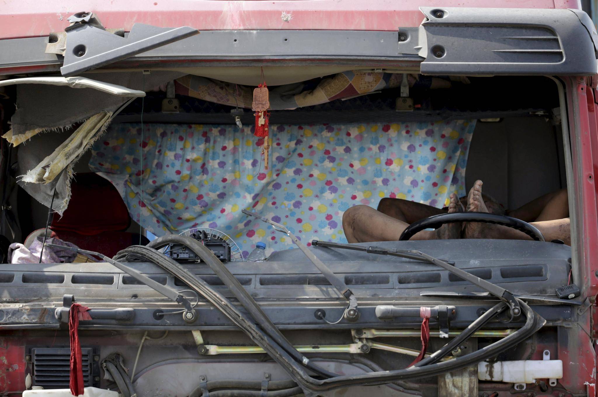 A man sleeps inside a damaged vehicle on a highway near the site of the explosions at the Binhai new district, Tianjin, August 13, 2015.JASON LEE/Reuters