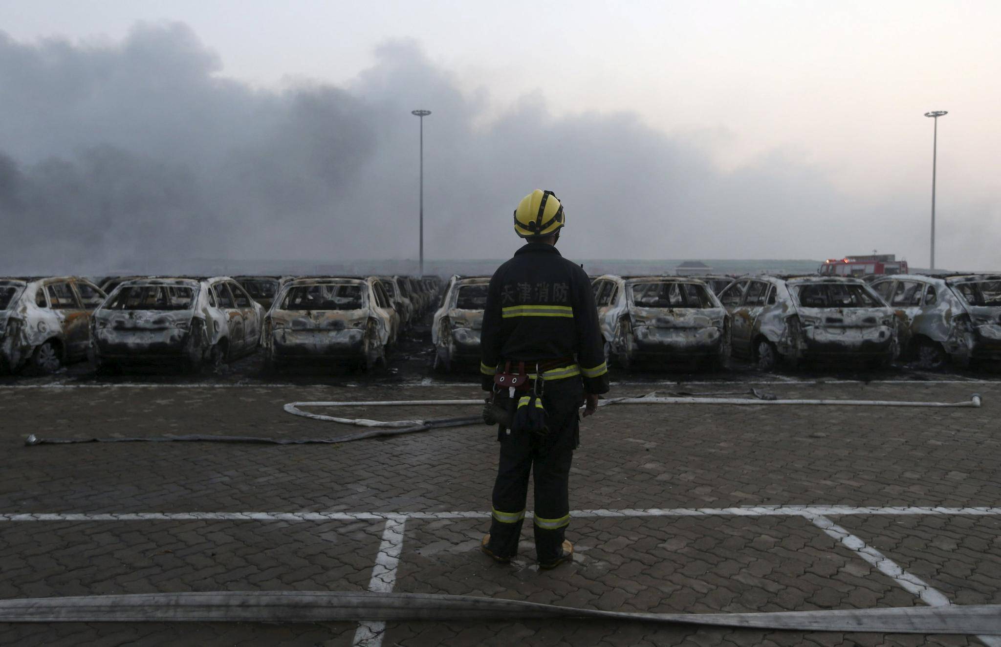 A firefighter looks on near damaged vehicles as smoke rises from the debris after the explosions at the Binhai new district in Tianjin, China, August 13, 2015.CHINA DAILY/Reuters
