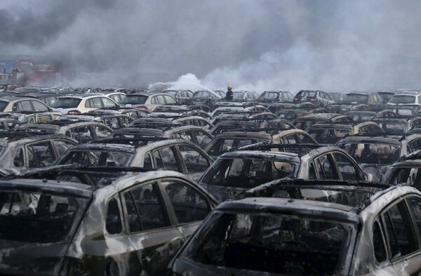 Vehicles are seen burning after blasts at Binhai new district in Tianjin municipality, China, August 13, 2015.STRINGER/CHINA/Reuters