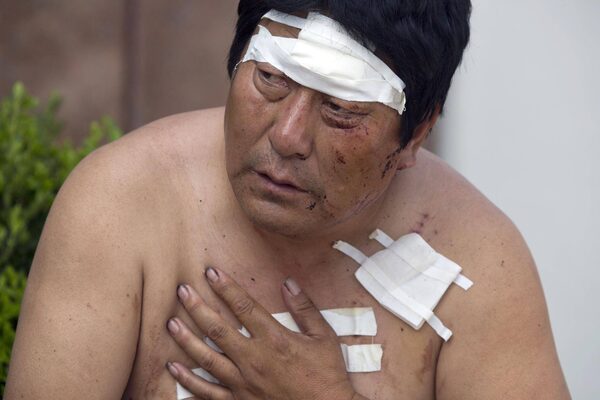A man with his wounds bandaged rests outside a hospital receiving victims of an explosion in northeastern China's Tianjin municipality, Thursday, Aug. 13, 2015.Ng Han Guan/The Associated Press