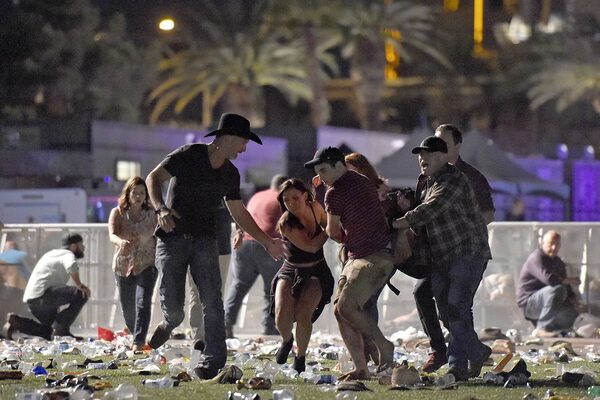 A man lays on top of a woman as others flee the shooting scene at the country music festival grounds.David Becker/Getty Images