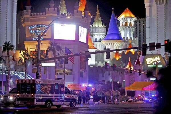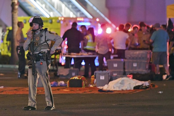 Las Vegas police and medical workers stage in the intersection of Tropicana Avenue and Las Vegas Boulevard.Steve Marcus/Reuters