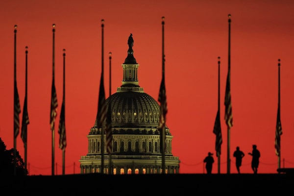 The sun rises behind the U.S. Capitol and flags at half-staff in honor of the victims killed in the Las Vegas shooting.Manuel Balce Ceneta/The Associated Press
