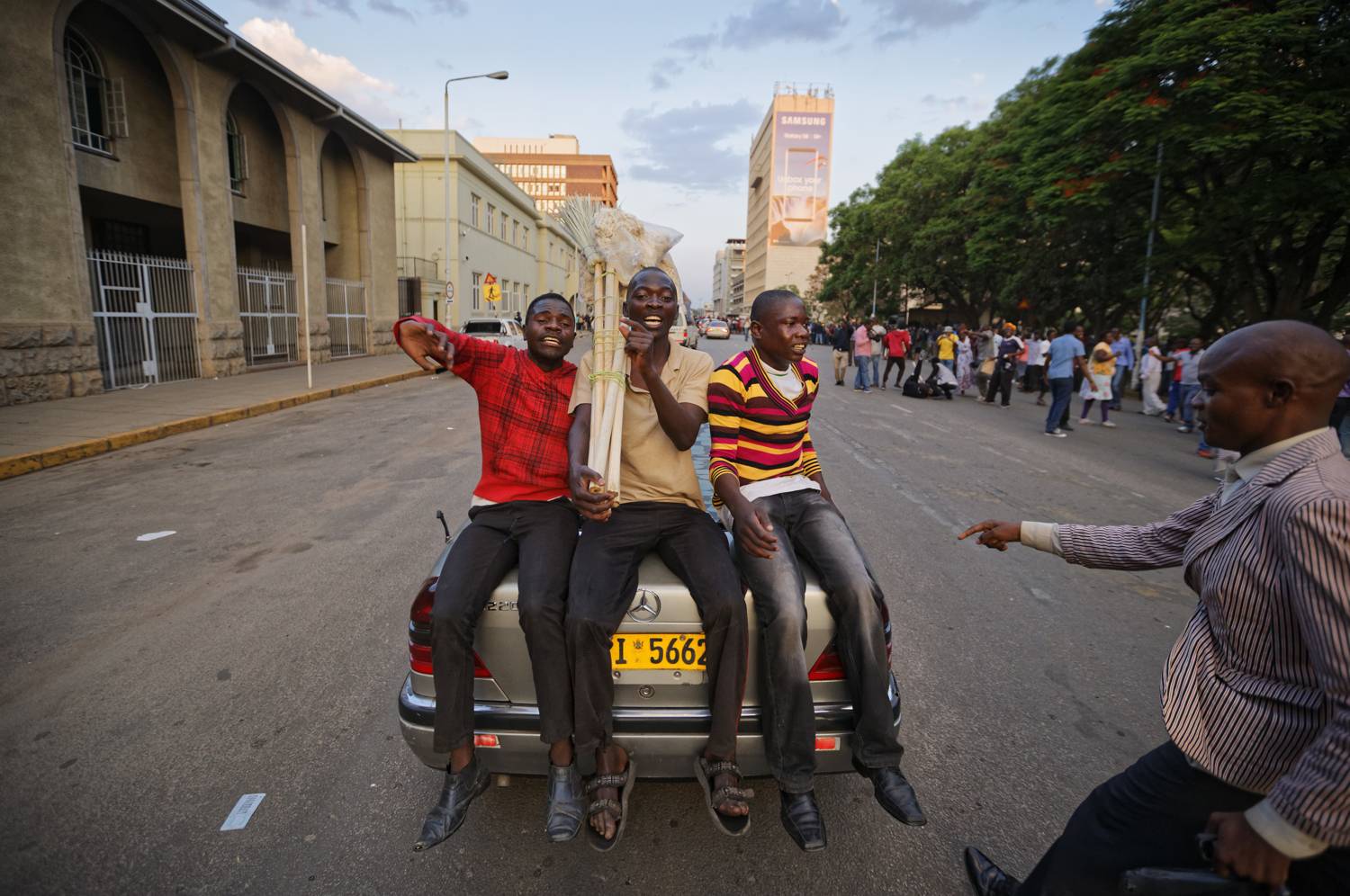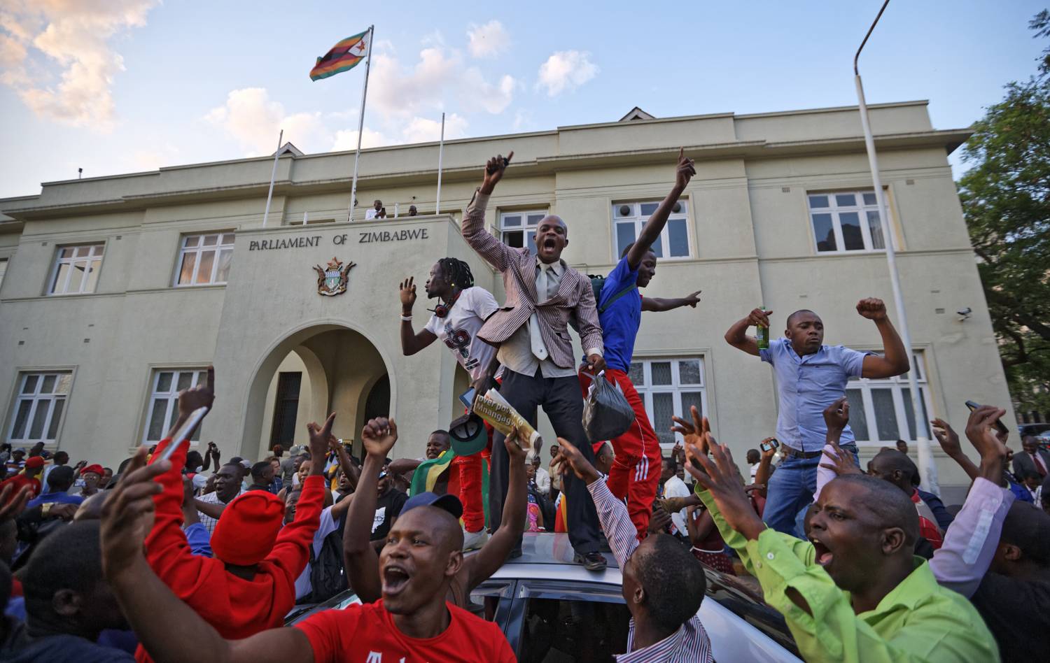Zimbabweans celebrate and ride on cars outside the parliament building immediately after hearing the news that President Robert Mugabe had resigned, in downtown Harare.Ben Curtis/The Associated Press