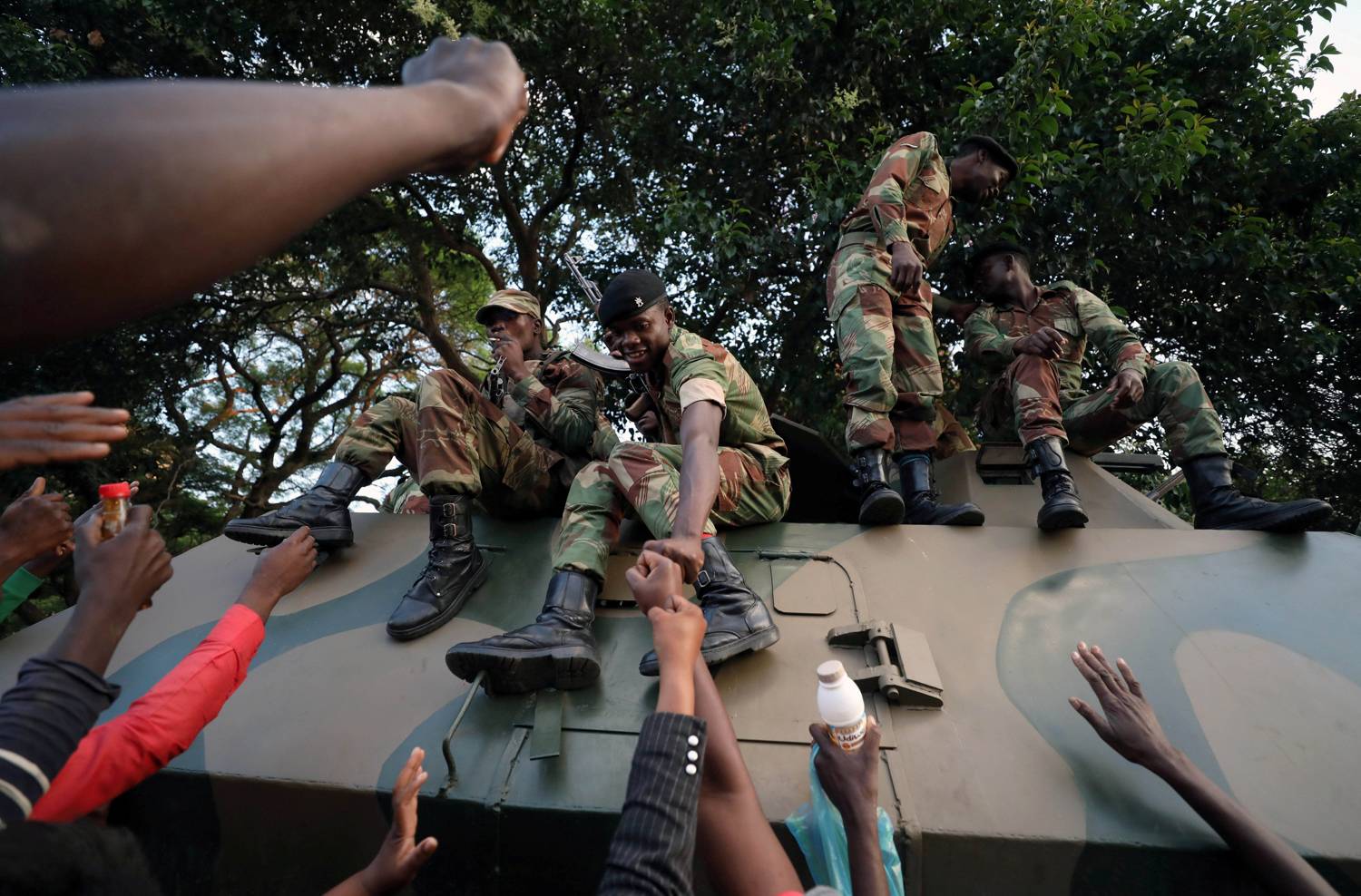 Zimbabweans celebrate with soldiers after President Robert Mugabe resigns in Harare.MIKE HUTCHINGS/Reuters