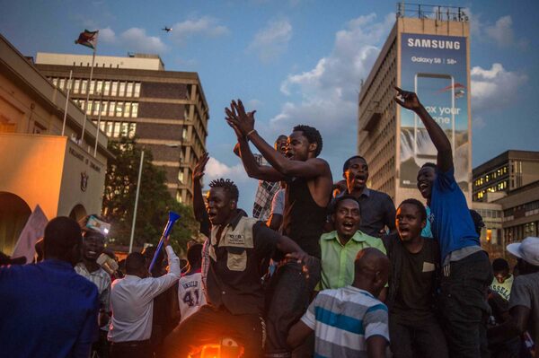 Zimbabweans celebrate outside the parliament building immediately after hearing the news that President Robert Mugabe had resigned, in downtown Harare.Ben Curtis/The Associated Press