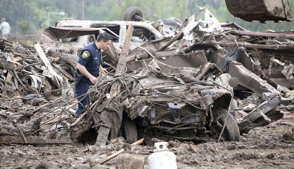 A rescuer searches the wreckage of a car.GENE BLEVINS/Reuters
