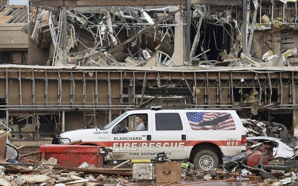 A fire official drives through the rubble of Moore Medical Center .GENE BLEVINS/Reuters
