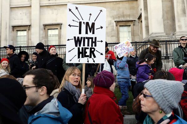 A protester takes part in the Women's March on London, as they walk from the American Embassy to Trafalgar Square, in central London, Britain January 21, 2017. The march formed part of a worldwide day of action following the election of Donald Trump to U.S. President.Neil Hall/Reuters