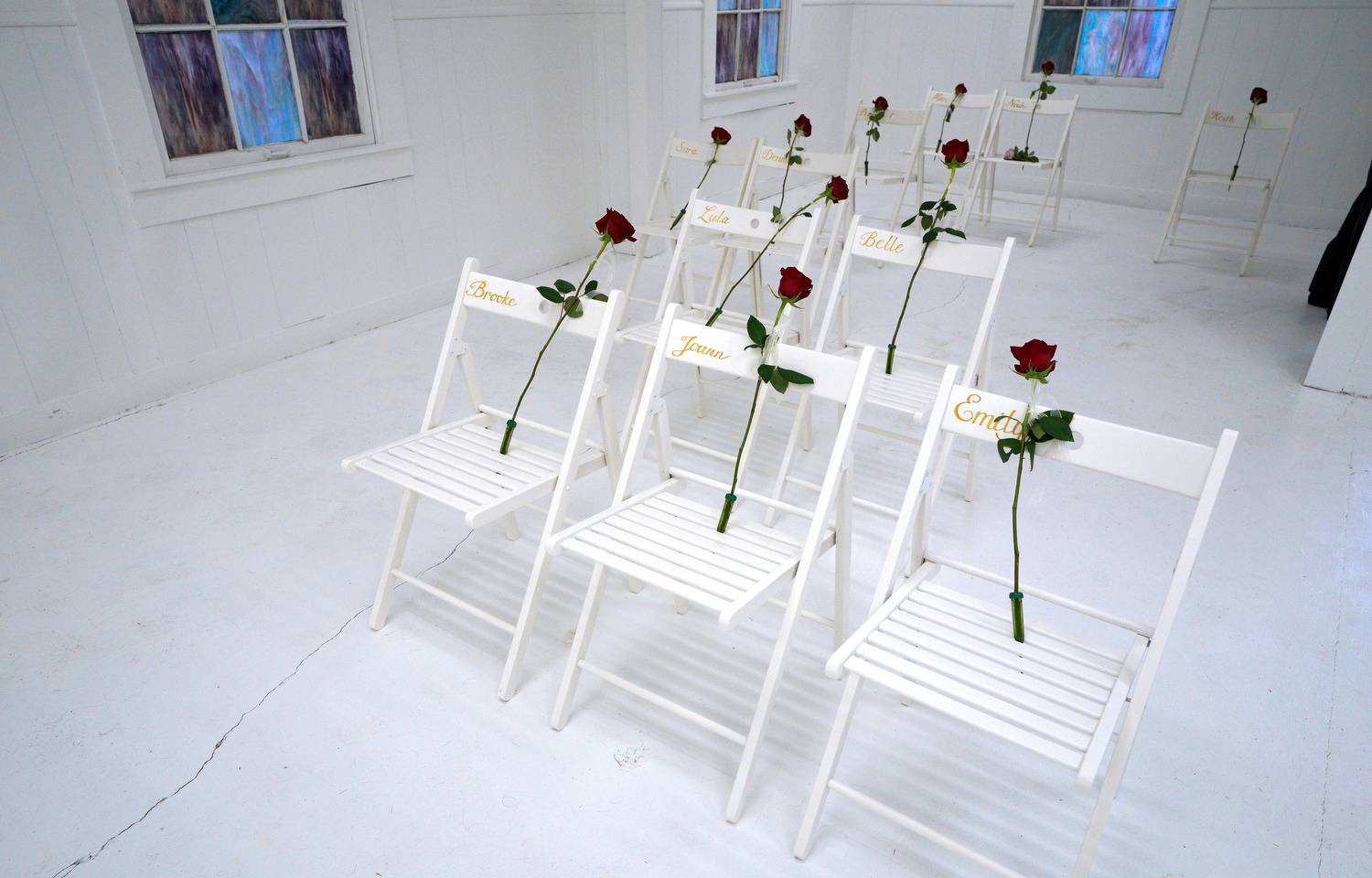 The memorial, including 26 white chairs, each painted with a cross, a name and a rose, is displayed in the church.Eric Gay/The Associated Press