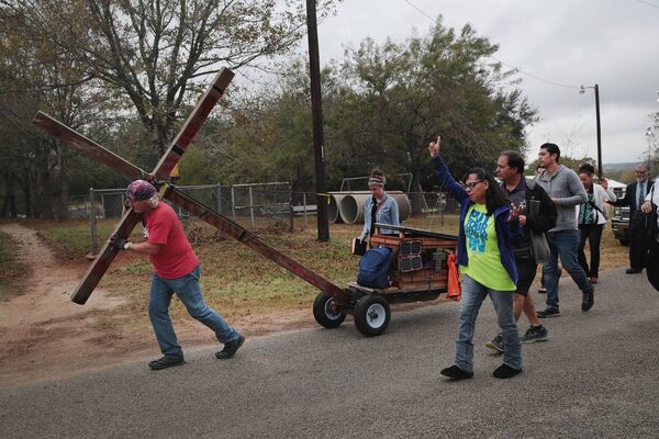 Stephen Hope pulls a cross through town after leaving Sunday service at the temporary First Baptist Church.Scott Olson/Getty Images