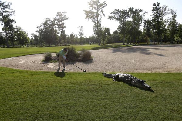 A worker grooms away tracks after an alligator crossed through a sand trap on the 14th hole during the first round of the PGA Tour Zurich Classic golf tournament at TPC Louisiana in Avondale, La., Thursday, April 25, 2013.Gerald Herbert/The Associated Press