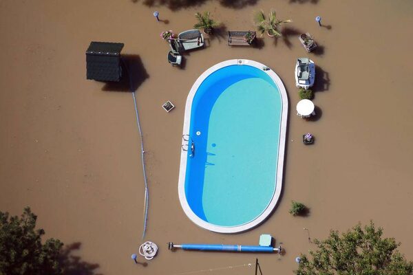 A garden with a swimming pool is inundated by the waters of the Elbe river during floods near Magdeburg in the federal state of Saxony Anhalt, Germany, June 10, 2013.THOMAS PETER/Reuters