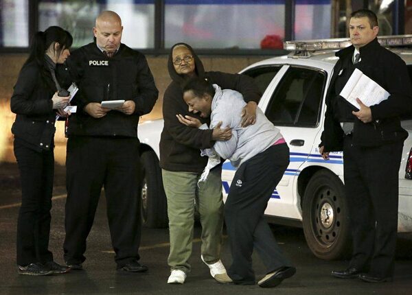 Toni Martin, front center, cries out on Wednesday, Dec. 24, 2014, as she talks to police at the scene where she says her son was fatally shot Tuesday at a gas station in Berkeley, Mo. Authorities did not immediately identify the man who was shot. But the St. Louis Post-Dispatch reported that Toni Martin, said he was her son, Antonio Martin.David Carson/St. Louis Post-Dispatch/The Associated Press