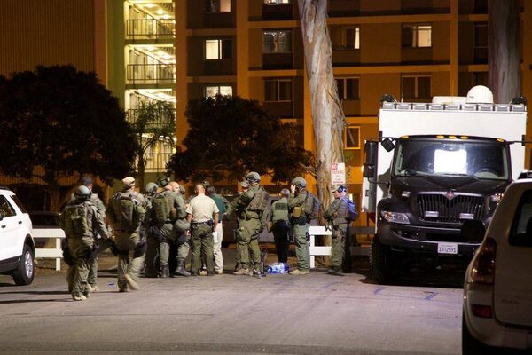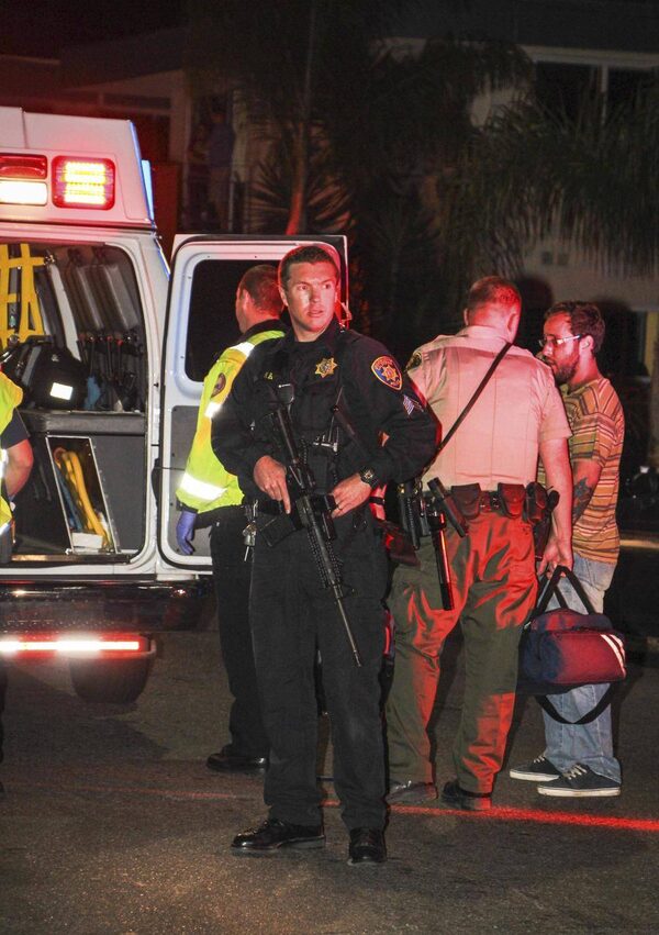 An armed police officer stands beside emergency personnel near the scene of a drive-by shooting in Isla Vista, a neighborhood of Santa Barbara, California May 23, 2014. A gunman sprayed bullets from a car, killing six people, before his car crashed and he was found dead inside, authorities said.Zack Warburg/Reuters