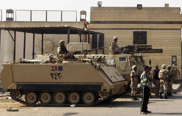 Egyptian soldiers man armoured personnel carriers in front of the main gate of Torah prison where former president Hosni Mubarak is detained on the outskirts of Cairo, August 21, 2013. Mubarak will leave jail as early as Thursday after a court ruling that jolted a divided nation already in turmoil seven weeks after the army toppled Islamist President Mohammed Morsi.AMR ABDALLAH DALSH/Reuters
