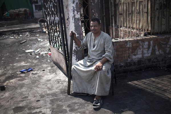 An Egyptian guard sits near the gate of the Rabaah Al-Adawiya mosque in Nasr city, Cairo, Egypt, Wednesday, Aug. 21, 2013.Manu Brabo/The Associated Press