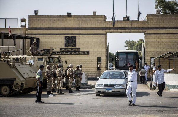 A police officer directs traffic outside of the gates of Torah prison, where former president Hosni Mubarak is currently being held, in Cairo, Aug. 21, 2013. An Egyptian court on Wednesday ordered Mubarak released from prison, saying all appeals by prosecutors to keep him behind bars had been exhausted.BRYAN DENTON/The New York Times