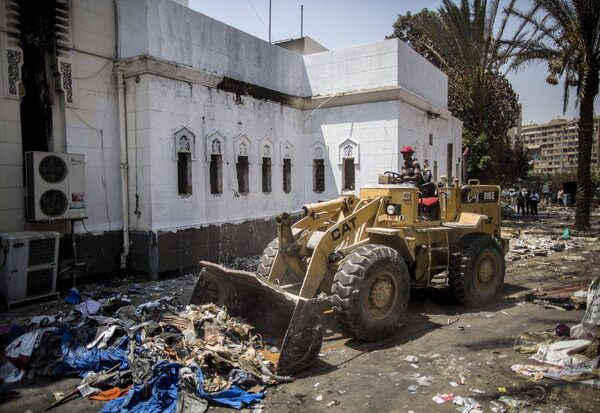 A bulldozer moves rubble and garbage in an alleyway adjacent to the Rabaa al-Adawiya mosque in Cairo, Aug. 21, 2013. The mosque, the site of a sit-in by supporters of ousted President Mohammed Morsi, was damaged during a government crackdown on pro-Morsi protesters.BRYAN DENTON/The New York Times