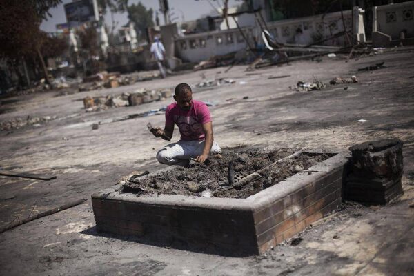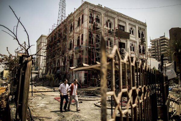 Pedestrians walk past a building adjacent to the Rabaa al-Adawiya mosque in Cairo, Aug. 21, 2013. The mosque, the site of a sit-in by supporters of ousted President Mohammed Morsi, was damaged during a government crackdown on pro-Morsi protesters.BRYAN DENTON/The New York Times