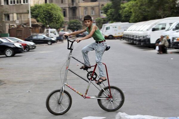 A Syrian boy living in Egypt rides his bicycle on a street in Cairo, August 21, 2013.MUHAMMAD HAMED/Reuters