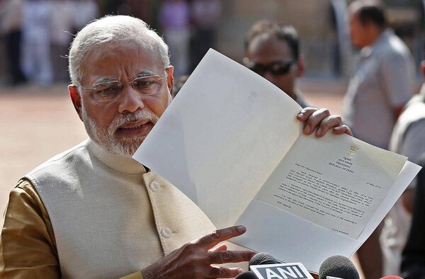 Hindu nationalist Narendra Modi, who will be the next prime minister of India, shows to the media a letter which he received from India's President Pranab Mukherjee after meeting him at the Presidential Palace in New Delhi May 20, 2014.ADNAN ABIDI/Reuters