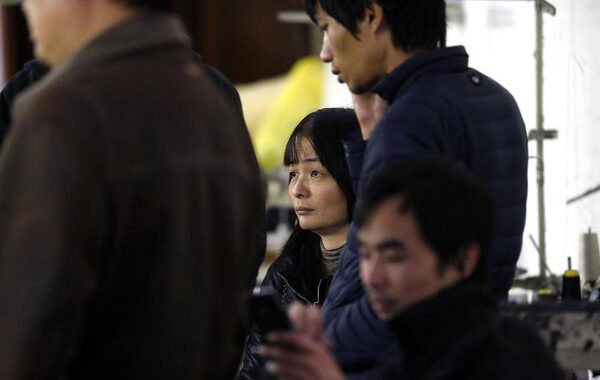 Shen Jianhe (centre) looks on with other Chinese immigrants as police officers conduct a check at the Shen Wu textile factory in Prato December 9, 2013.STEFANO RELLANDINI/Reuters