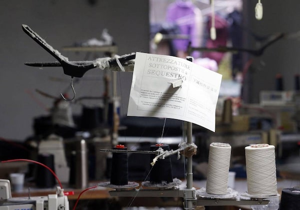 A paper that reads "Equipment confiscated" is seen on an industrial sewing machine as police officers conduct a check at the Shen Wu textile factory in Prato December 9, 2013.STEFANO RELLANDINI/Reuters