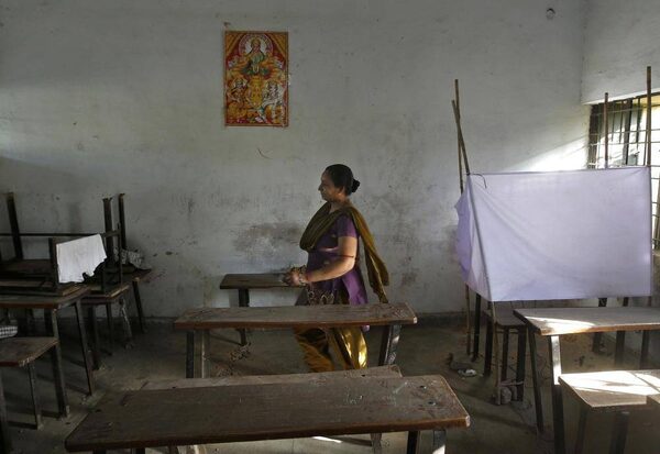 A poster of a Hindu goddess is seen on the wall as a voter leaves after casting her at a polling station during the general election in Bhangel village on the outskirts of New Delhi April 10, 2014.ADNAN ABIDI/Reuters