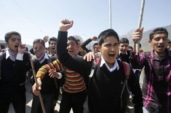 Kashmiri schoolboys shout freedom slogans during a rally by Jammu Kashmir Liberation Front (JKLF) against the ongoing general elections in Bandipora, about 75 km from Srinagar, India, Thursday, April 10, 2014.Mukhtar Khan/The Associated Press