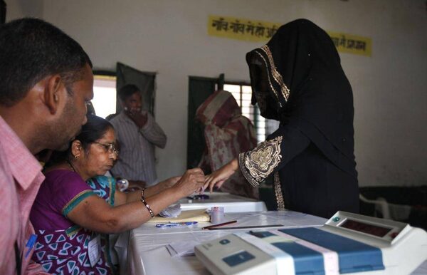 An Indian woman get her finger marked with indelible ink before casting her vote at a polling booth near Shahpur village in Muzaffarnagar, in the northern Indian state of Uttar Pradesh, Thursday, April 10, 2014.Altaf Qadri/The Associated Press
