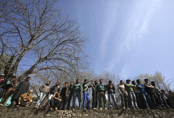Kashmiris watch from a distance a rally by Jammu Kashmir Liberation Front (JKLF) against the ongoing general elections in Bandipora, about 75 kilometers (47 miles) from Srinagar, India, Thursday, April 10, 2014. JKLF along with several other separatist organizations have jointly appealed to the people of Jammu and Kashmir state to boycott Indian parliamentary elections. India started the world's largest election Monday where the country's 814 million electorate will vote in stages over the next five weeks.Mukhtar Khan/The Associated Press