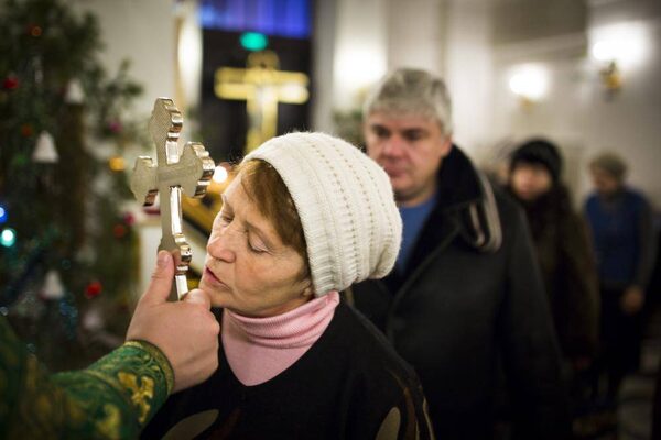 Worshipers kiss the cross held by Orthodox Priest Alexei Kulberg during a service at The Bolshoi Zlatoust Church (translates as the "Big (or Great) Chrysostom" Church) in Yekaterinburg, Russia, January 15, 2014.John Lehmann/The Globe and Mail