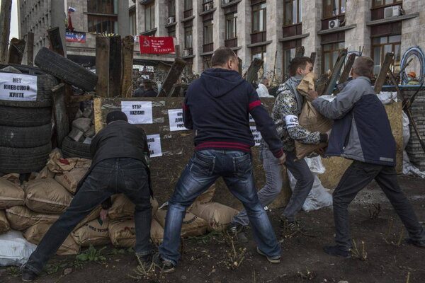Pro-Russian protesters fortify a barricade with sand bags by the entrance of the regional government building that was seized by the demonstrators, in Donetsk, Ukraine, April 9, 2014. Facing threats of forcible eviction by the Ukrainian government, the pro-Russian demonstrators who have seized the building suffered a further blow Wednesday when local political barons who share their deep dislike of Ukraine’s new government demanded that they give up and hand over any weapons.MAURICIO LIMA/The New York Times