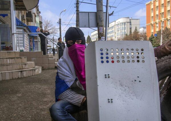 Pro-Russians protect the regional administration building in Donetsk, Ukraine, which they seized on Monday in a declaration of independence from Ukraine