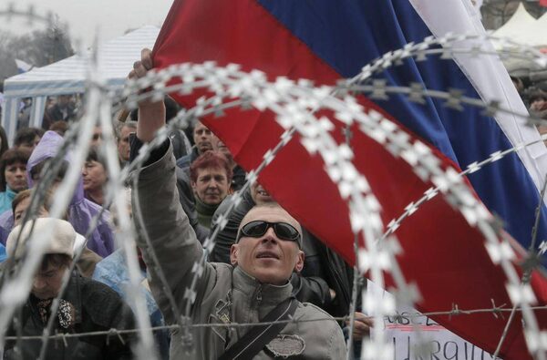 A pro-Russian activist waves a Russian flag during a rally at the barricade in front of regional administration building in Donetsk, Ukraine, Thursday, April 10, 2014.Efrem Lukatsky/The Associated Press