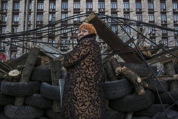 A pro-Russian resident watches Russian President Vladimir Putin on a nearby television set up in front of a fortified barrier outside the regional government building that was seized by protesters, in Donetsk, Ukraine, April 9, 2014.MAURICIO LIMA/The New York Times
