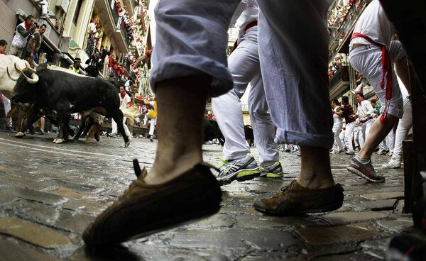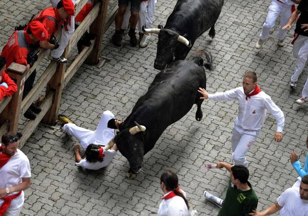 Thousands of adrenalin-fueled runners sprinted alongside fighting bulls in the streets of the northern Spanish city of Pamplona in the first running of the bulls of this year’s San Fermin festival. One elderly thrill-seeker was gored in the leg and five others were slightly injured.