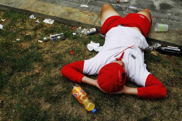 A reveler sleeps next to empty bottles of alcohol on the street after the first running of the bulls.SUSANA VERA/Reuters
